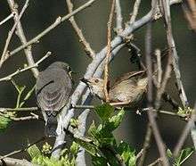 A juvenile brown-backed honeybird (left) with host parent rock-loving cisticola