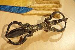 - (Buddhism) a vajra, a dorje: a kind of double-headed scepter used in esoteric Buddhism