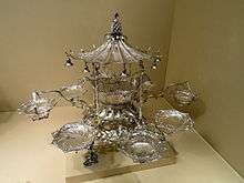 - A table centerpiece, usually made of silver, generally consisting of a central bowl with radiating dishes or holders.