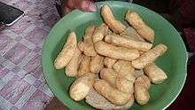 - doughnut, fritter (fried sweet piece of dough)