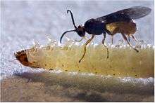 Bracon brevicornis inserting ovipositor into paralyzed host