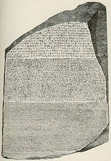 1. A large inscribed stone found near Rosetta, Egypt, in 1799; later used as a basis for understanding many previously undecipherable examples of hieroglyphic writing.