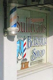 - A type of sign used by barbers, most traditionally a pole with a helix of red and white stripes, in the US including blue, sometimes moving.