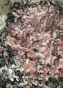 - (mineralogy) A lilac-pink or red triclinic-pinacoidal rare-earth mineral of interest also for cleaning up radioactive and other wastes and for ceramics.