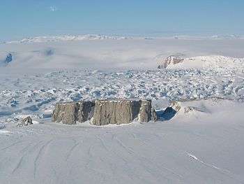 - A mountain top or rocky element of a ridge that is surrounded by glacial ice but is not covered by ice; a peak protruding from the surface ice sheet.