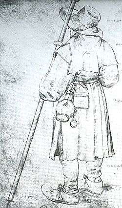 Een Europese pelgrim draagt op deze tekening van Pieter Bruegel de Oude de jacobsschelp van de bedevaart naar Santiago de Compostella en tal van andere, waarschijnlijk loden, bedevaartstekens