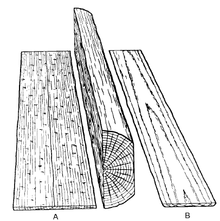 - To cut into boards using parallel cuts that are tangential to the growth rings.