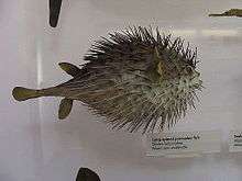 - Any of several tropical fish species in the family Diodontidae that are covered with sharp spines and inflate themselves when threatened.