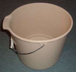 - bucket, pail (cylindrical metal, wooden, or plastic container with a handle)