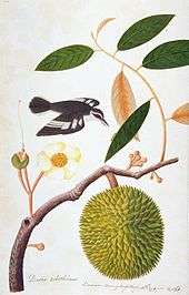 A 19th-century watercolour of a pied triller (Lalage nigra) flying near a durian tree (Durio zibethinus), from the William Farquhar Collection of Natural History Drawings, National Museum of Singapore