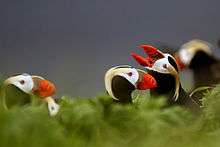 - A species of puffin, Fratercula cirrhata, easily distinguished by its thick bill and trademark pair of tufts on its head.