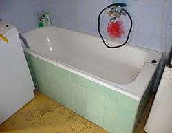 - bathtub, tub (large container for water in which a person may bathe or wash something)