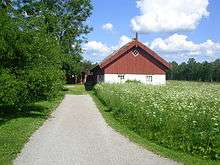 vitemenad ladugård med faluröd påbyggnad