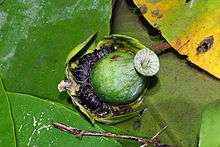 - Any of several species of Nuphar; the yellow frog lily; so called from the shape of the seed vessel.